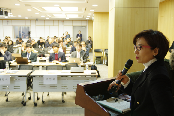 ▲17일 국회의원회관 제3세미나실에서 열린 '다시쓰는 대한민국 게임강국 프로젝트' 포럼에서 첫 발제자로 나선 게임위 여명숙 위원장이 발표를 하고 있다. (사진=게임위)