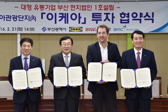 부산시와 부산도시공사는 21일 오후 부산시청에서 글로벌 유통기업인 이케아(한국대표 안드레슈미트갈)와 부산을 본사로 하는 현지법인을 설립하고, 동부산관광단지(오시리아)에 진출한다는 협약식을 가졌다.