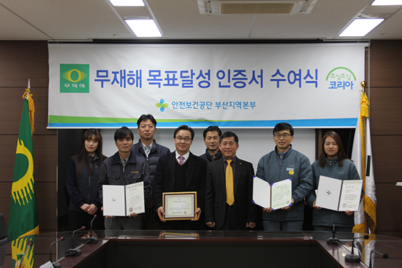 안전보건공단 부산지역본부(본부장 김병진)는 8일 본부 회의실에서 무재해를 달성한 (주)일광엔지니어링과 (주)포스코건설 해운대 LCT 신축공사현장에 무재해 목표달성 인증패 및 인증서를 수여하고 유공직원을 표창했다.