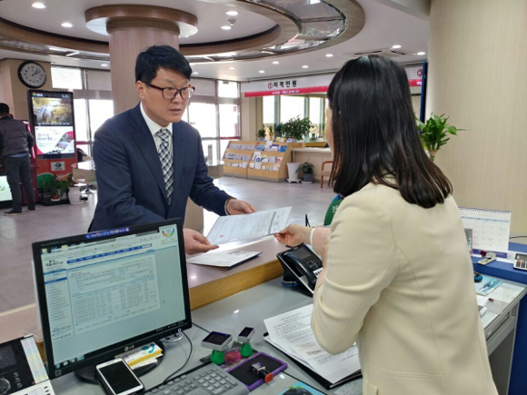 ▲함안더퍼스트 지역주택조합추진위원회 조현화 위원장(왼쪽)이 21일 오후 함안군청을 방문해 지역주택조합 설립인가 신청서를 제출하고 있다. (사진=(가칭)함안더퍼스트 지역주택조합)