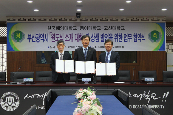 부산 원도심에 자리 잡고 있는 대학인 동아대, 한국해양대, 고신대가 인적·물적 자원을 공유하고 다양한 분야에 걸쳐 협력 사업을 추진하기로 업무협약을 맺었다.