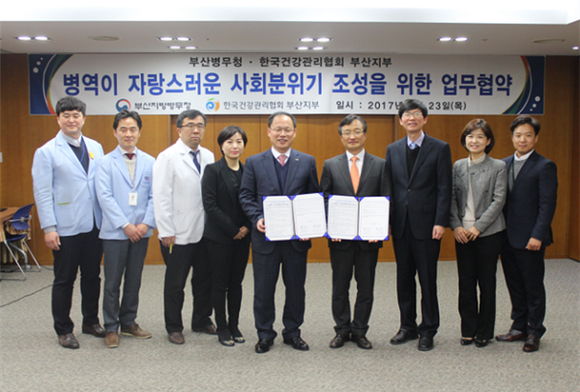 한국건강관리협회 부산지부(본부장 조승진)는 부산병무청(청장 임재하)과 병역명문가와 가족들의 건강증진과 삶의 질 향상에 기여하고자 최근 건강증진 업무협약을 체결했다.