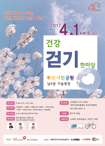 국민건강보험 부산지역본부(본부장 김선옥)는 4월 1일 오전 9시부터 오후 1시까지 부산시민공원 다솜광장 등 일원에서 '건강보험 40주년, 비만예방 실천 확산을 위한 2017년 건강걷기한마당' 축제를 개최한다.