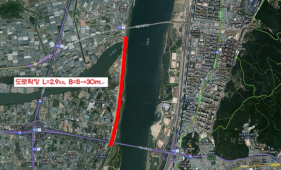 이번 도로는 2011년 5월 기본 및 실시설계 용역을 완료하고, 2011년 10월 대동수문 교량을 확장하는 1공구 공사를 착공해 2013년 10월 완료했으며, 2012년 5월 도로확장 공사(2공구)를 착공했다. 도로개설 구간은 연약지반 개량이 필요하여 구간별 지반 조건에 맞는 다양한 연약지반 처리공법을 적용, 경제적이고 신속한 공사추진과 지반개량으로 인한 주변 건물 등의 피해 최소화를 위하여 노력해 왔다.