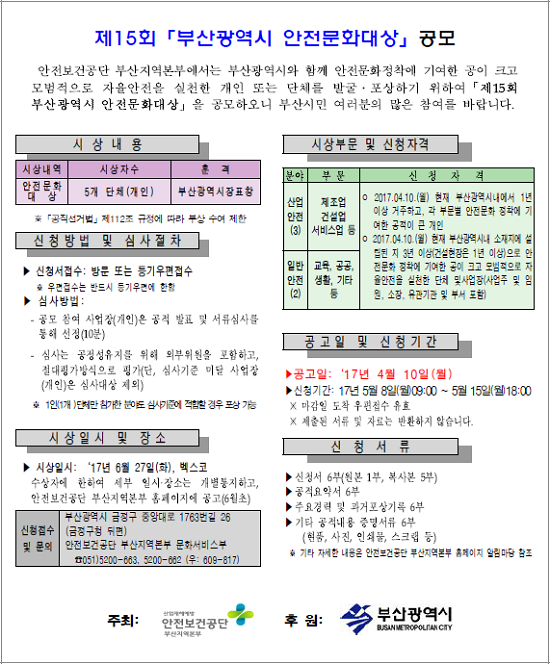 '제15회 부산시 안전문화대상'은 부산시장 표창으로 산업안전 분야(제조업, 건설업, 서비스업 등 부문) 일반안전 분야(교육, 공공, 기타 등 부문)로 구분하여 총 5개 사업장(개인)에게 수상된다.