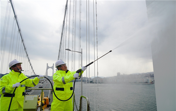 광안대교를 상징하는 하얀 주탑이 겨우내 묵은 때를 벗고 새 봄을 맞아 말끔한 모습으로 새단장한다.
