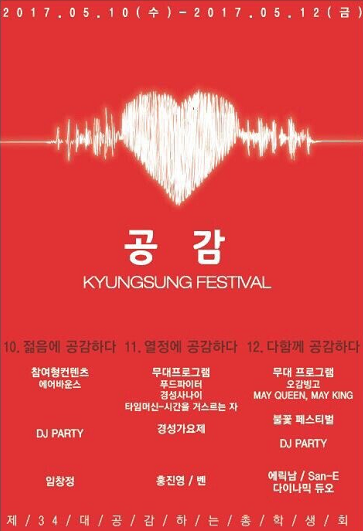 또한 대동제 축제인 만큼 '다함께 크게 어울려 화합하는 장'에서 대학문화제를 공감하기 위해 경성대는 사흘 동안 하루씩 ▲젊음에 공감하다 ▲열정에 공감하다 ▲다함께 공감하다 라는 주제를 정해 학우들과 지역민에게 다가갈 예정이다.
