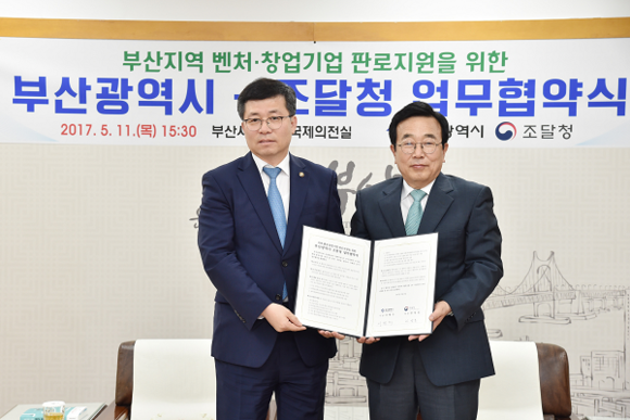 부산시와 조달청은 11일 부산시청에서 지역 벤처·창업기업 상품을 조달청 '벤처나라'에 등록해 공공조달 판로를 지원하기 위한 업무협약(MOU)을 체결했다.