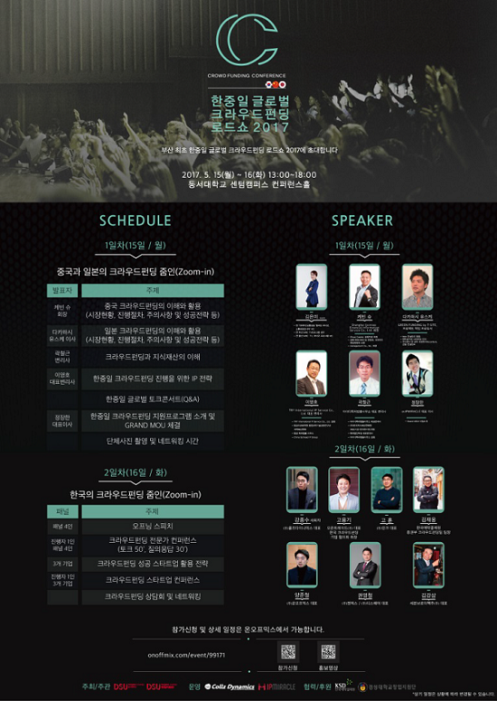 부산지역 최초의 '한중일 글로벌 크라우드펀딩 로드쇼 2017'가 오는 15, 16일 양일간 동서대학교 센텀캠퍼스 컨퍼런스홀에서 개최된다.