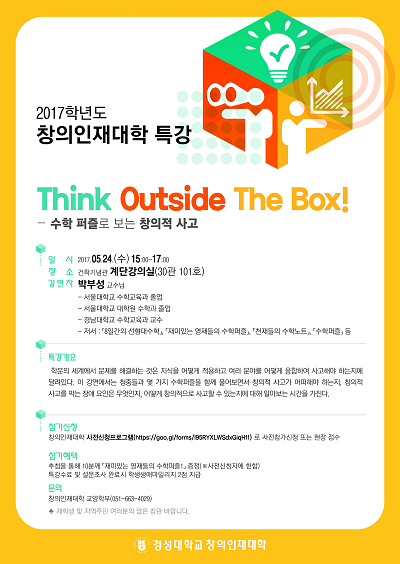 경성대학교(총장 송수건) 창의인재대학은 재학생과 지역주민을 대상으로 오는 24일 오후 3시부터 건학기념관 계단강의실(30관 101호)에서 'Think Outside the Box! - 수학 퍼즐로 보는 창의적 사고'라는 주제로 특강을 개최한다.