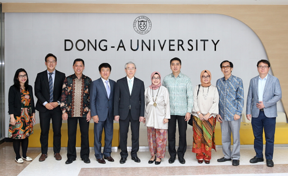 ▲23일 동아대 부민캠퍼스에서 협정 체결식 후 문철주(왼쪽 네 번째) 국제교류처장, 최형림(왼쪽 다섯 번째) 경영대학장 및 인도네시아 STIE Ekuitas 대학 관계자들이 기념촬영을 하고 있다. (사진=동아대)