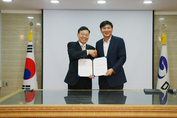 ▲오른쪽부터 무학 최재호 회장, 경남도립남해대 홍덕수 총장. (사진=무학)