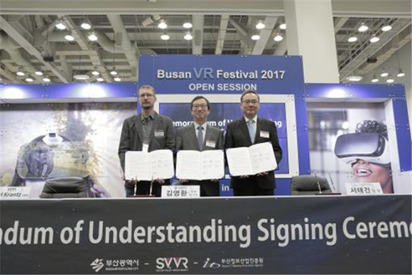 부산시는 1일 벡스코 제2전시관에서 김영환 부산시 경제부시장, 서태건 부산정보산업진흥원장, 칼 크란츠 SVVR(Silicon Valley Virtual Reality) 협회장을 비롯한 관계자 등이 참석한 가운데 부산시와 SVVR, 부산정보산업진흥원 간 'SVVR코리아 부산 설립' 등 3자 업무협약을 체결했다고 밝혔다.