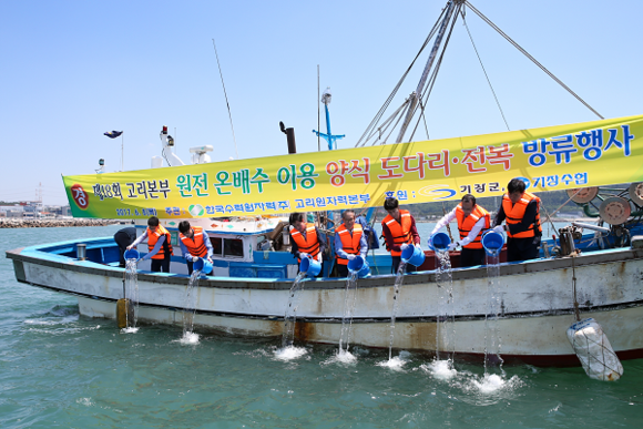 이날 행사에 참석한 내·외빈들은 직접 어선을 타고 월내항 앞바다에 나가 8cm 크기의 강도다리 치어 4만미를 방류했다. 또 전복치패 총 6만미는 발전소 인근 지역인 기장군 월내, 길천, 임랑어촌계별로 나눠 수중 암반에 부착할 예정이다. 이날 바다에 뿌린 치어와 전복치패는 경주월성원자력본부 양식장에서 온배수를 활용해 키워낸 것이라고 고리본부는 밝혔다.