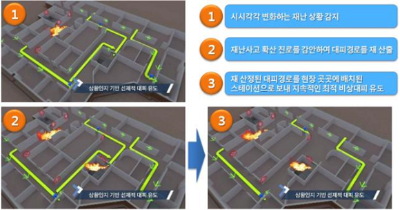 이 시스템의 핵심은 ①재난발생 시 일체형 센서를 통해 상황정보 수집 ②중앙관제실에서 3D 공간모델로 정보를 확인함으로써 실시간 안전대피경로 최단시간 자동 결정 ③결과를 실제 대피 현장에 설치된 스마트 안전 에이전트에 전달, 음성·화살표·조명 등을 통해 단순 명료하게 대피경로를 표시해 신속하게 고객들을 대피로로 안내하는 것으로 요약된다.