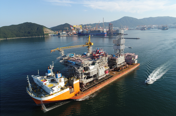▲지난 8일 대우조선해양이 건조한 고정식 해양플랜트가 바지선에 실려 영국지역 북해 대륙붕으로 설치를 위해 출항했다. (사진=대우조선해양)