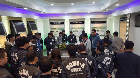 ▲동아대 계약학과인 산업공학과 재학생들이 우수기업 벤치마킹 연수 현장에서 기업체의 설명을 듣고 있다. (사진=동아대)