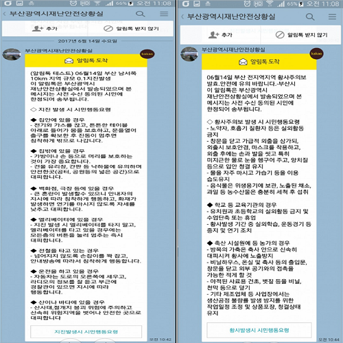 부산시는 오는 19일부터 부산시 원-클릭 재난전파시스템에 연계해 지진 등 긴급 재난정보와 시민행동요령을 동시에 전파하는 '카카오 재난 알림톡(이하 재난알림톡)'을 전국 최초로 운영한다고 16일 밝혔다.