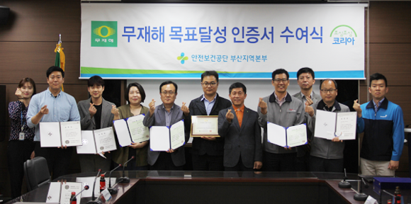 안전보건공단 부산지역본부(본부장 김병진)는 16일 지역본부 회의실에서무재해를 달성한 동부부산컨테이너터미널(주), 부산환경공단 해운대사업소, 부산환경공단 서부시설사업소, (주)금호개발상사 백양사업소에 무재해 목표달성 인증패 및 인증서를 수여하고 유공직원을 표창했다.