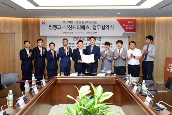 BNK금융그룹 부산은행은 모바일 전문은행 '썸뱅크'의 컨텐츠를 강화하고 부산지역 여행, 관광 산업 활성화를 위해 ㈜패스앤트립(대표 박재홍)과 19일 부산은행 본점에서 '썸뱅크-부산시티패스' 업무협약을 채결했다.