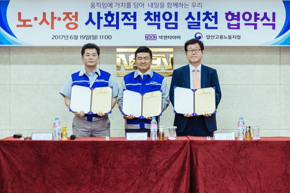 이날 협약식에 참석한 넥센타이어 강호찬 대표이사, 박주홍 노조위원장, 고용노동부 유재식 양산지청장을 비롯한 관계자들은 노∙사∙정이 상호 협력해 사회적 책임 실천활동을 적극적으로 추진할 것을 약속했다.