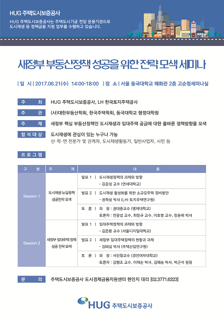 주택도시보증공사(HUG, 사장 김선덕)는 '새정부 부동산정책 성공을 위한 전략 모색'을 주제로 오는 21일 동국대학교에서 세미나를 개최한다.