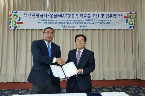 ▲오른쪽부터 부산관광공사 신용삼 상임이사, 몽골 MIAT항공 타미르 사장. (사진=부산관광공사)