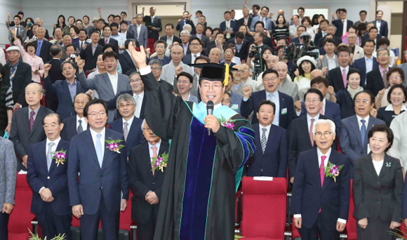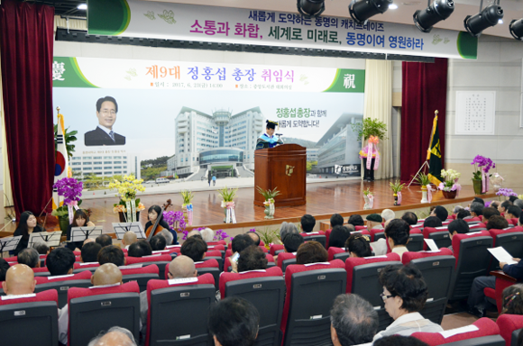 정홍섭 동명대 제9대 총장이 23일 오후 2시 대학 중앙도서관에서 가진 취임식에서 “총장이 가진 모든 권위는 내려놓고 희생과 봉사를 솔선수범하며 투명성과 공정성을 기본으로 대학을 경영해 동명대를 세계적인 명문대학으로 우뚝 세우겠다고 다짐했다.