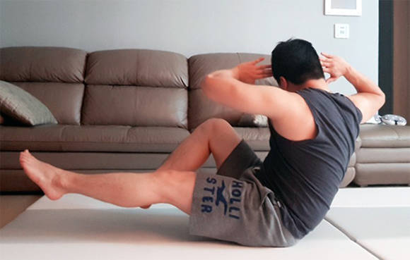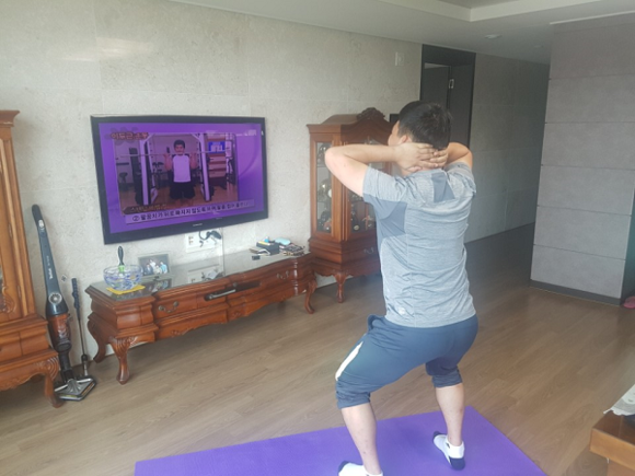 ▲한 남성이 집에서 홈트레이닝으로 스쿼트 운동을 하고 있다.