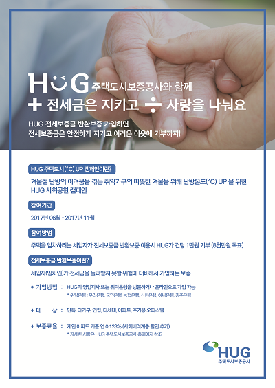 주택을 임차하려는 세입자가 전세보증금반환보증을 이용하면 HUG가 건당 1만원씩 기부한다. 오는 6월부터 11월까지 진행되며 8천만원의 기부금 조성을 목표로 하고 있다.
