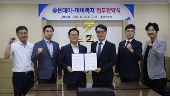 무학은 5일 부산 학장동 남부산물류센터에서 중소기업 복지솔루션 전문회사인 ㈜마이복지와의 업무협약을 통해 중소기업 근로자들의 검강검진, 레저·문화, 종합검진, 쇼핑·외식과 자기계발 등의 복지개선을 위한 컨텐츠 개발 비용을 좋은데이가 전액지원하는 업무협약을 체결했다.