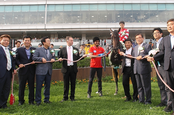 ▲9일 열린 제13회 부산시장배에서 우승을 차지한 '아임유어파터'와 이희천 기수가 서병수 부산시장을 비롯한 대회 관계자들과 기념촬영을 하고 있다. (사진=렛츠런파크 부경)