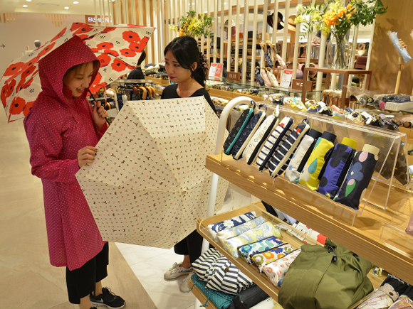 롯데백화점 부산본점 지하 1층 패션잡화 매장에서는 장마철을 맞아 우산과 우비 등을 찾는 고객이 크게 증가하고 있는 가운데, 매장을 방문한 한 고객이 레인코트와 우산을 살펴보고 있다. (사진=롯데백화점)