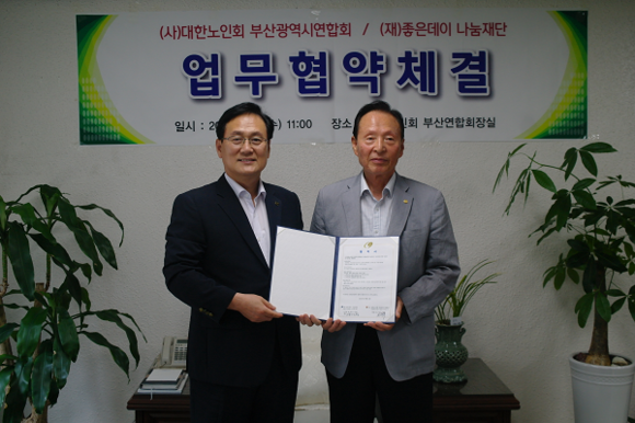 이날 협약식에는 강민철 좋은데이나눔재단 이사(무학 대표이사), 좋은데이나눔재단 권기재, 문영래 본부장과 (사)대한노인회 부산시연합회 문우택 회장, 김종곤 사무처장 등 관계자 10여 명이 참석한 가운데 진행됐다.