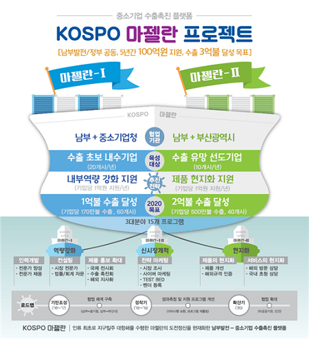 먼저 중기청과는 내년까지 60개 중소기업 수출 1억 달러 달성을 목표로, 'KOSPO 마젤란-Ⅰ, 상생서포터즈 프로그램'을 운영해 수출 경험이 부족한 청년창업기업의 내부역량 강화에 나서며, 부산시와는 올해부터 `20년까지 40개 중소기업 수출 2억 달러 달성을 위한 'KOSPO 마젤란-Ⅱ, 에너지 유망기업 수출 동행사업'을 추진, 수출 역량이 있는 부산시 소재 유망 중소기업의 제품 현지화를 지원한다.