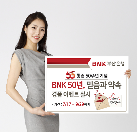 BNK금융그룹 부산은행이 창립 50주년을 기념해 고객 사은 행사로 'BNK 50년, 믿음과 약속' 경품 이벤트를 17일부터 9월 29일까지 실시한다.
