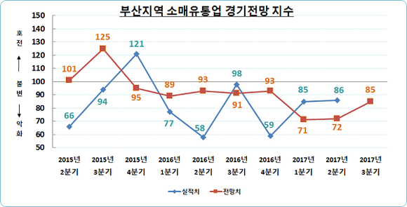 조사에 따르면 3분기 부산의 소매유통업 경기전망지수(RBSI)는 '85'를 기록해 여전히 기준치(100)를 하회했다.