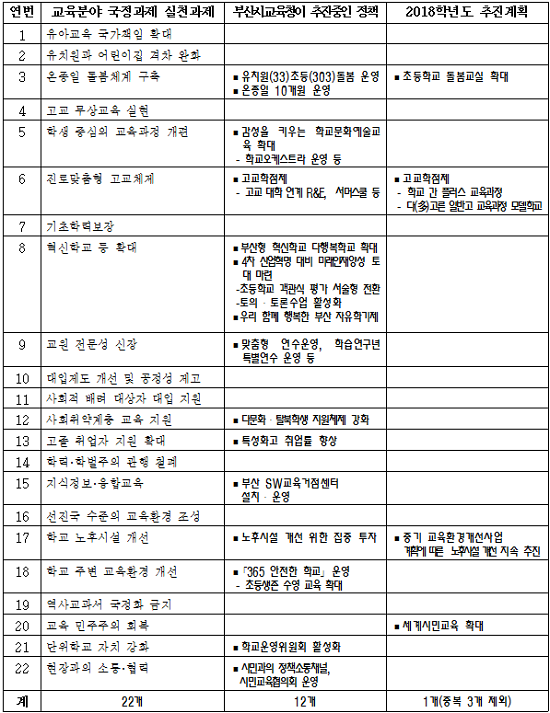 교육 민주주의 회복(세계 시민교육 확대) 등 1개 과제는 부산교육청이 2018학년도에 추진할 계획인 정책과 그 맥을 같이 하는 것으로 나타났다.