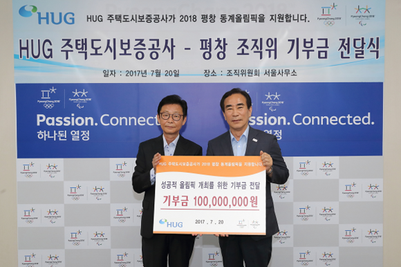 주택도시보증공사(HUG, 사장 김선덕)는 2018 평창 동계올림픽 및 패럴림픽 대회의 성공적인 개최를 기원하며 조직위원회에 기부금 1억원을 전달했다고 21일 밝혔다.