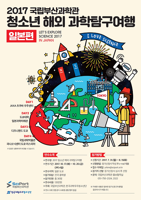 국립부산과학관(관장 이영활)은 중학생을 대상으로 '2017 청소년 해외과학탐구여행(일본편)'을 개최한다고 22일 밝혔다.