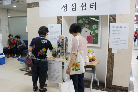 셀프바로 운영되는 성심쉼터는 둥글레차, 우엉차, 주스 등 다양한 음료를 제공하며, 오후 1시부터 3시까지 하루 2시간 이용 가능하다.
