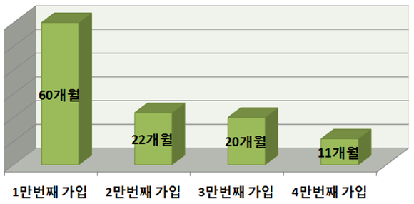 특히 주택연금의 증가 속도가 점차 빨라져 1만번째 가입자(`12년 8월)가 나오기까지는 5년 ▲2만번째 가입자(`14년 6월) 22개월 ▲3만번째 가입자(`16년 2월) 20개월 ▲4만번째 가입자(`17년 1월)까지는 11개월이 걸렸다.