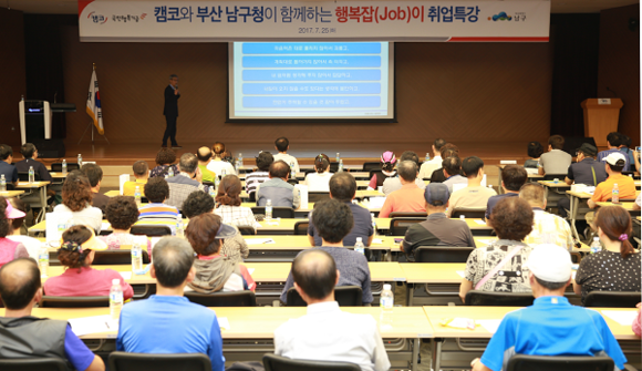 한국자산관리공사(캠코, 사장 문창용)는 25일 오후 2시부터 4시까지 본사(BIFC) 3층 캠코마루에서 국민행복기금 신용회복지원 고객과 부산 남구 지역서민 등 재취업을 희망하는 중·장년층 약 170명을 대상으로 '행복잡(Job)이 취업 특강'을 개최했다.