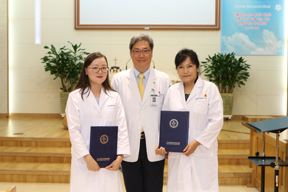 ▲고신대복음병원에서 연수를 맡은 가나 간취멕씨와 나라 차차란씨가 임학 고신대복음병원장(가운데)과 기념촬영을 하고 있다.