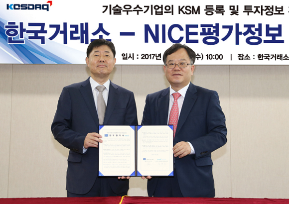 한국거래소 코스닥시장위원회(위원장 김재준)는 26일 거래소 서울사옥에서 스타트업기업 지원 및 KSM 활성화 등을 위해 나이스평가정보(대표 심의영)와 업무협약(MOU)을 체결했다.