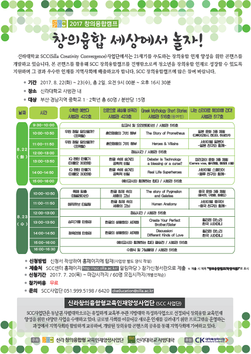 SCC사업단은 이번 캠프기간 동안 수학, 인문, 영어, 문화 4개 영역에서 ▲수학은 예쁘다 ▲인문으로 세상을 바꿔라 ▲Greek Mythology Short Stories ▲나는 신라대로 해외여행 간다 등의 강좌를 운영한다.