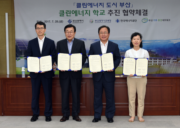 28일 오전 부산시청 회의실에서 서병수 부산시장, 김석준 부산시교육감, 강남훈 한국에너지공단 이사장, 최인화 부산기후환경네트워크 회장 등이 참석한 가운데 '클린에너지학교 조성을 위한 업무협약식'이 열렸다.