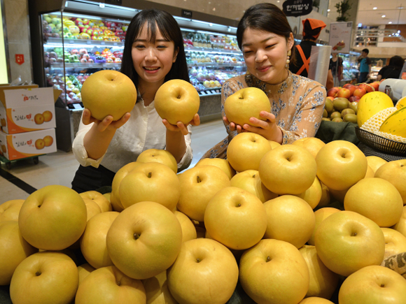롯데백화점 광복점 지하 1층 식품관에 가을 과일의 대표상품인 햇배를 벌써 출시해 고객들에게 선보이고 있다. 경북 김천에서 올해 첫 수확한 햇배는 원황배로 과즙이 많고 당도가 높은 조생품종이다. (사진=롯데백화점)