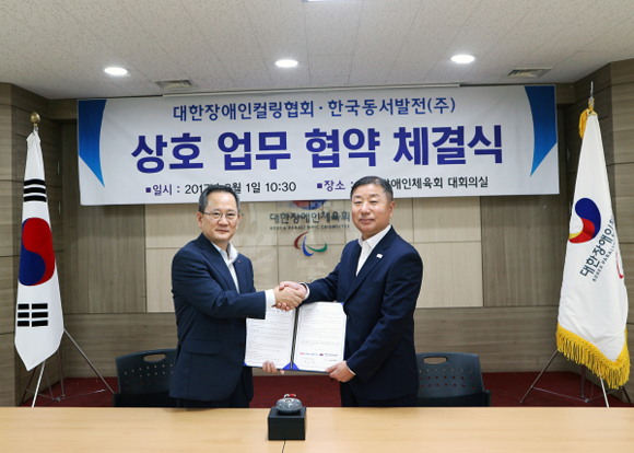 한국동서발전(사장 직무대행 박희성)는 1일 오전 대한장애인체육회 회의실에서 대한장애인컬링협회(협회장 최종길)와 '2018 평창 동계 패럴림픽'에 출전하는 휠체어컬링 국가대표팀의 장비를 지원하는 협약식을 가졌다.