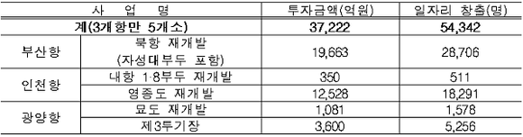 이번 국정과제상 항만재개발사업에서는 부산항(북항), 인천항, 광양항 등 3개 항만에 대해 5개의 세부사업을 추진하며, 해수부는 2022년까지 6년간 3조 7천억 원 규모의 민간투자를 통해 5만 4천여 명의 일자리를 창출해 나갈 계획이다.